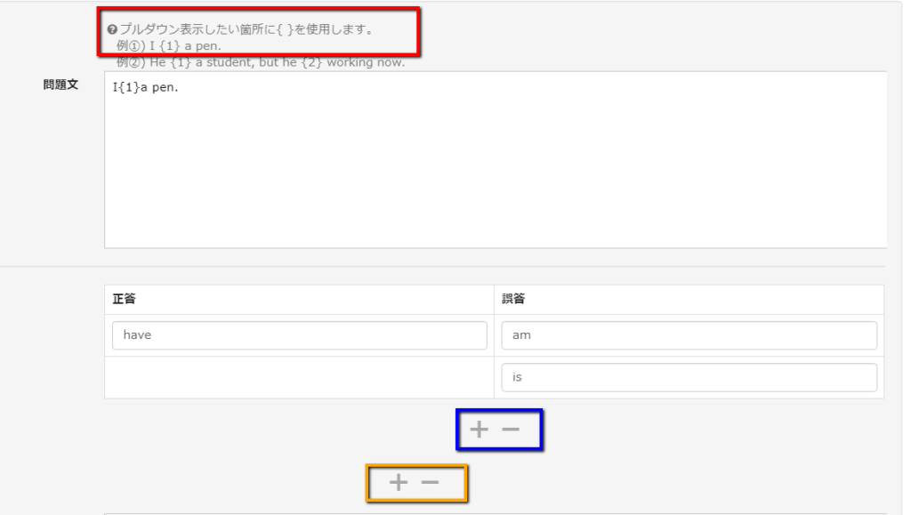 各ブロックの1行目が設問文で、設問文の中に{}で閉じている部分がプレーヤーでプルダウンリストが表示される部分になります。2行目は固定で”pulldown:”、3行目に一番左に正しい選択肢を記述し、"::"区切りで間違った選択肢を記述します。