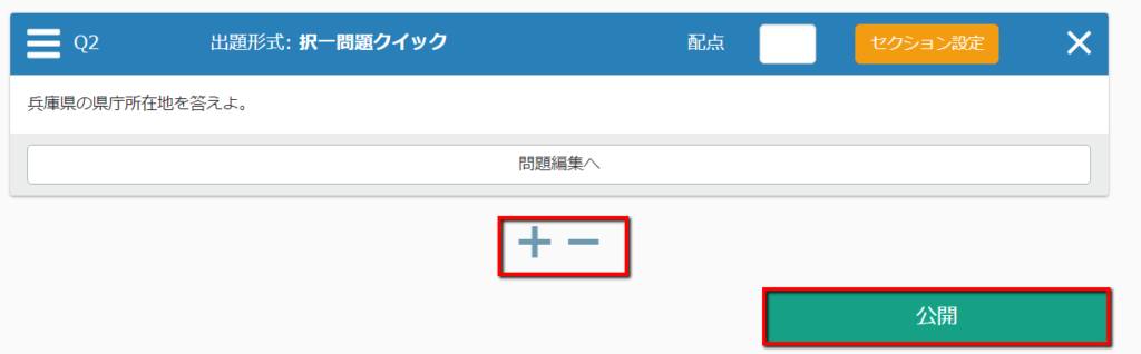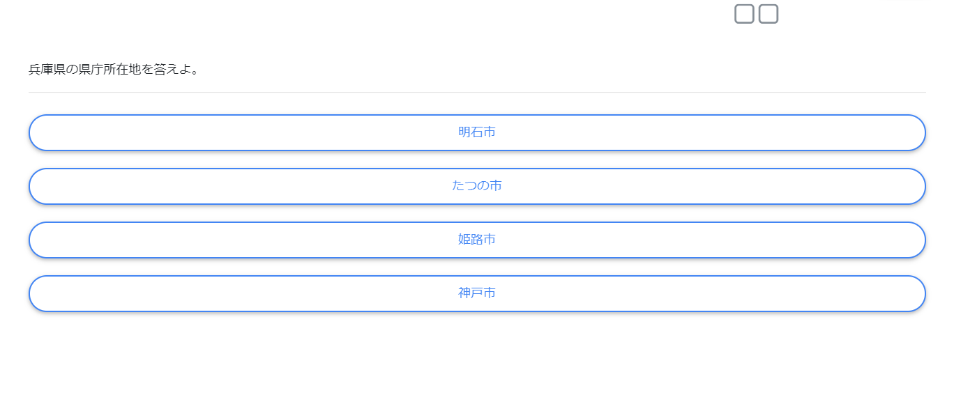 以下の例では、1問目の問題文は「北海道」、正解の選択肢は「札幌市」、間違いの選択肢は「函館市」「帯広市」「苫小牧市」です。