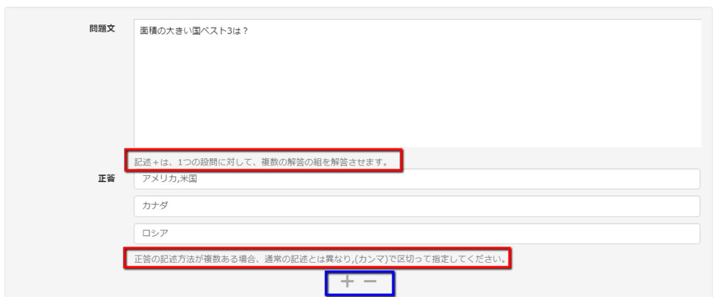 正答の記述方法が複数ある場合(「米国」でも「アメリカ」でも正答としたい場合)、fill-inとは異なり、カンマ(,)で区切って指定する点にご注意ください。