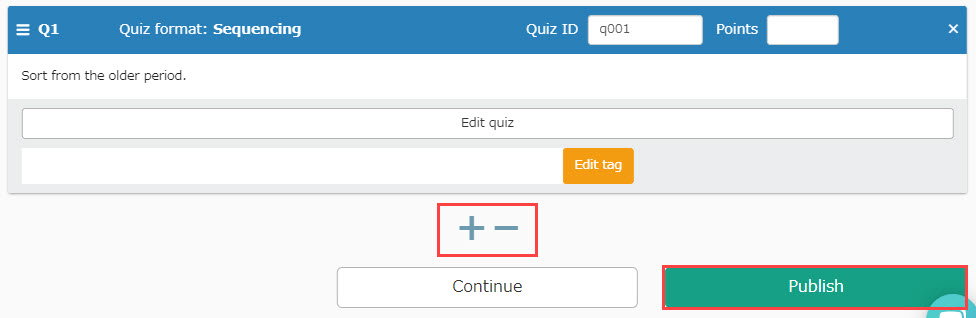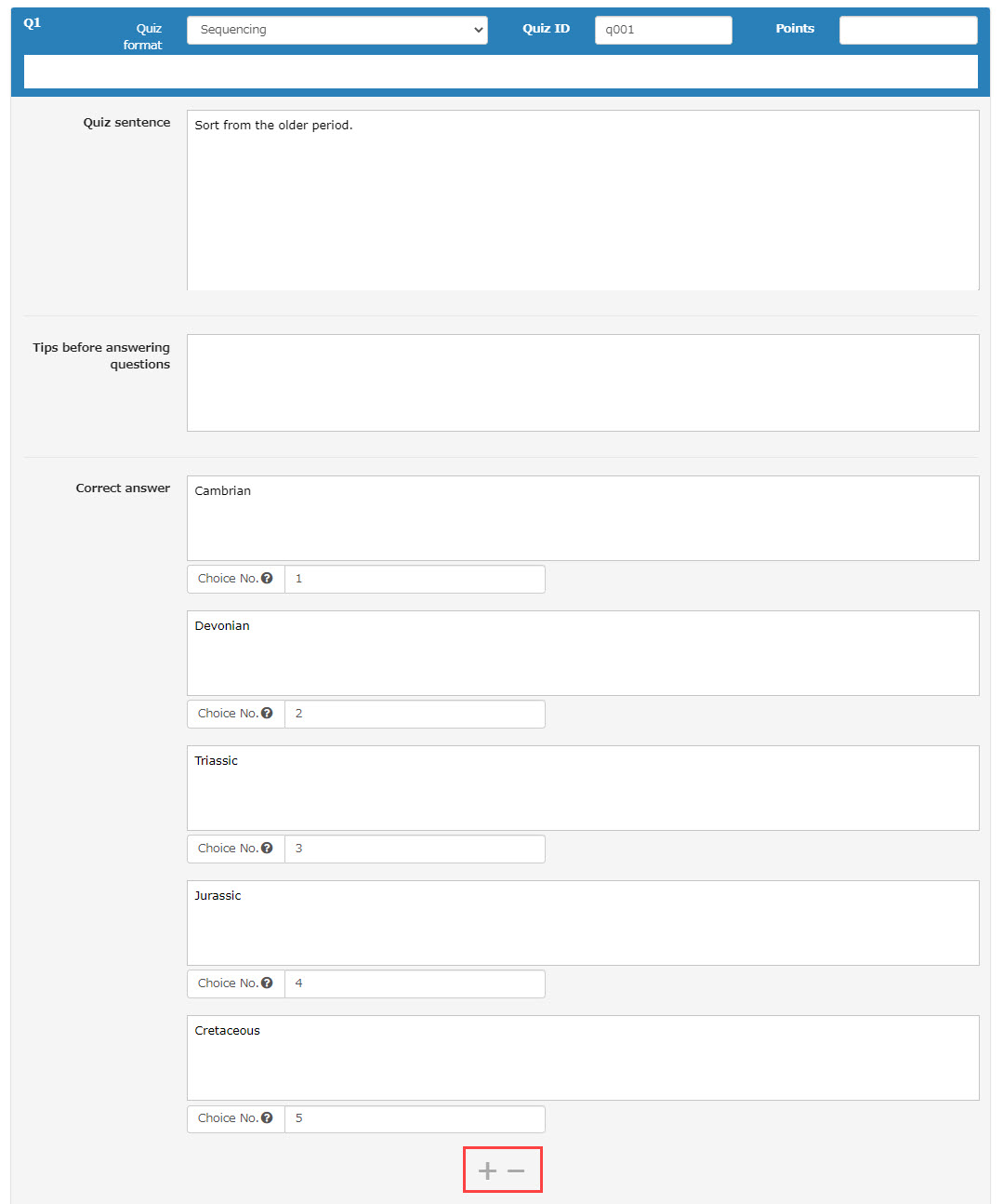 The first line, starting with #, is the setting for the entire quiz. The question data should be entered between blank lines. The first line of each block is the question sentence, the second line is "sort:", and the third and the following lines contain the choices in the correct order from top to bottom.