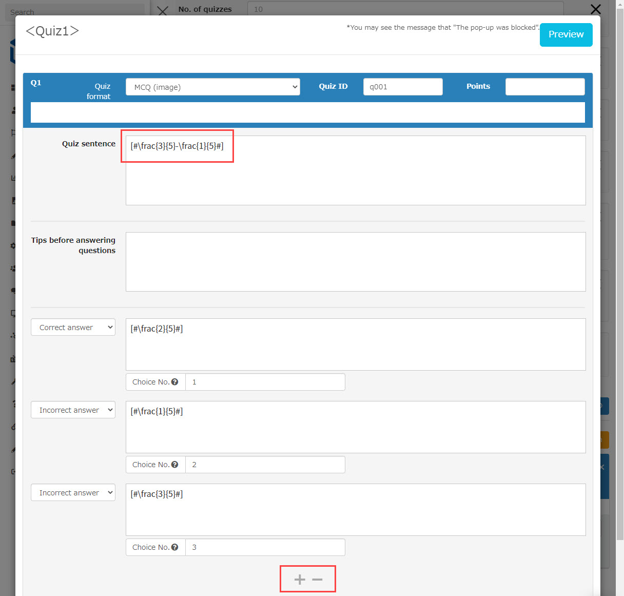 QuizGenerator can create questions with mathematical expressions. If you write a formula between [# and #] in LaTeX format, it will be converted to an image and displayed in the question.