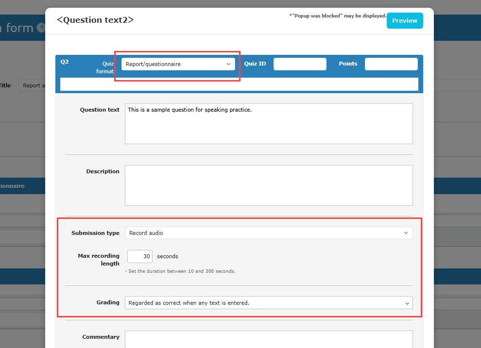 You can create "voice input" questions for quiz and test questions by recording your voice directly and submitting it.